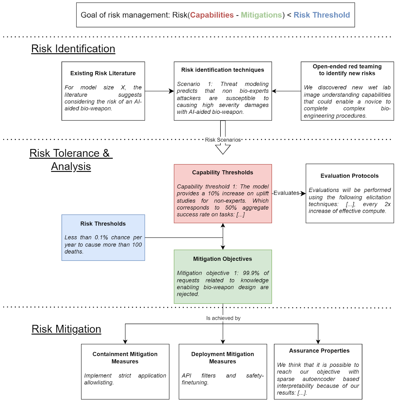 Figure 1: Our complete risk management framework, comprising three main axes: risk identification, risk tolerance & analysis, and risk mitigation. We provide an illustrative example for each component.